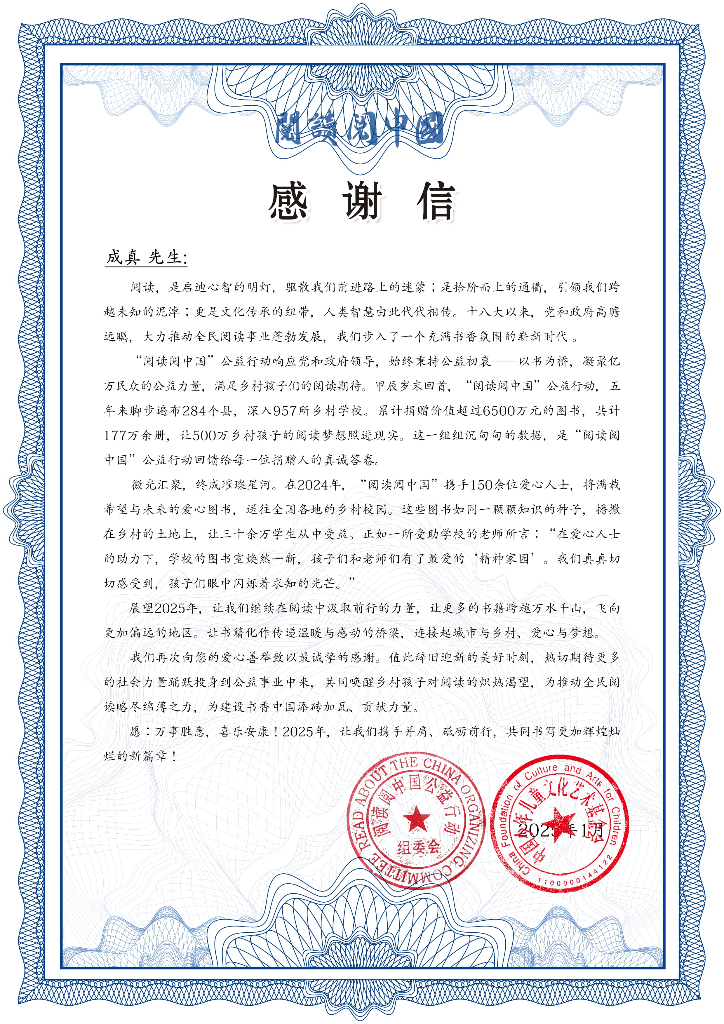 “阅读阅中国”公益行动发给成真老师感谢信
